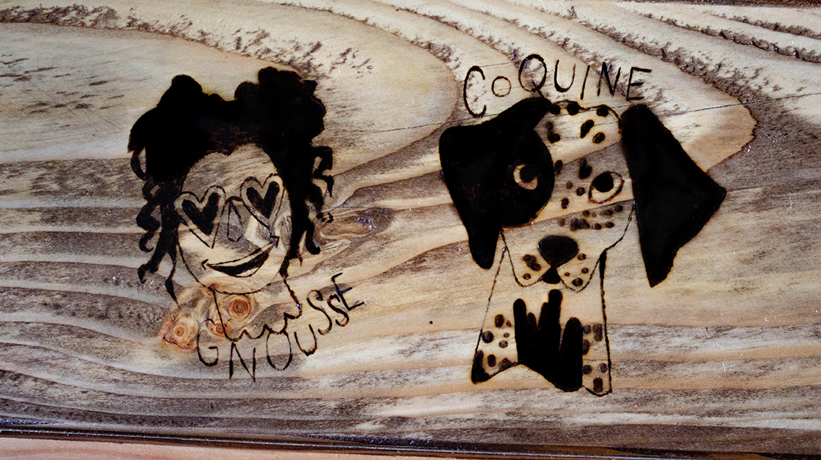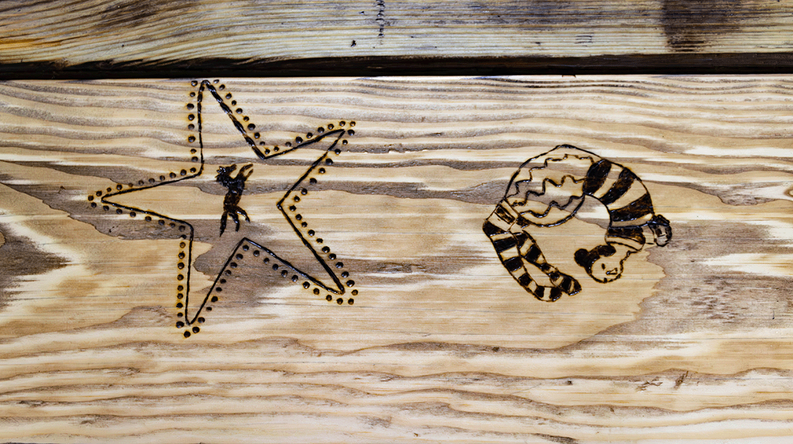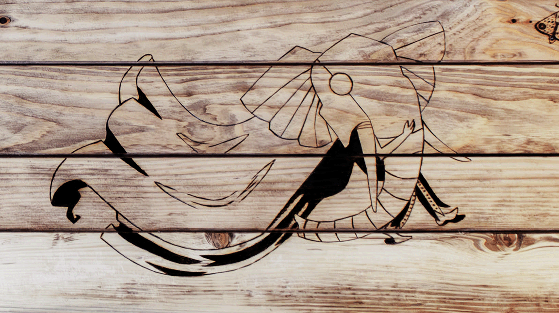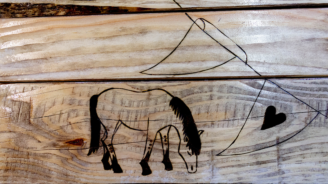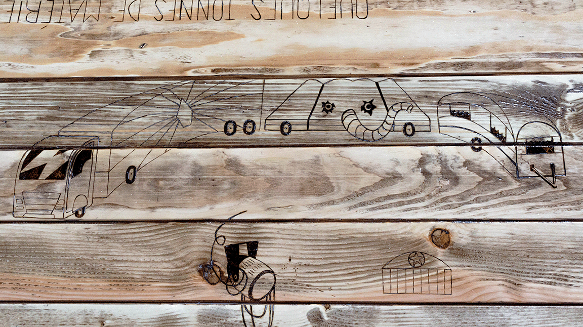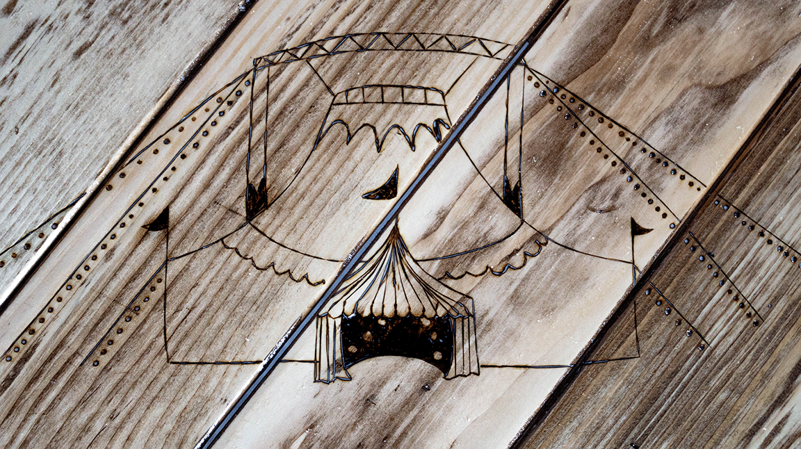 Pyrogravure sur 5 tables en bois pour la scénographie du spectacle « Zusammen » de la Compagnie Equinote. Illustrations qui représentent les disciplines, la technique et le quotidien d’une troupe de cirque équestre.